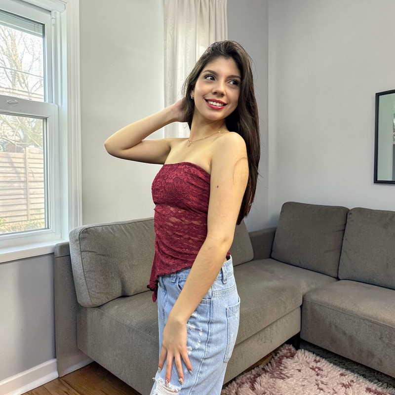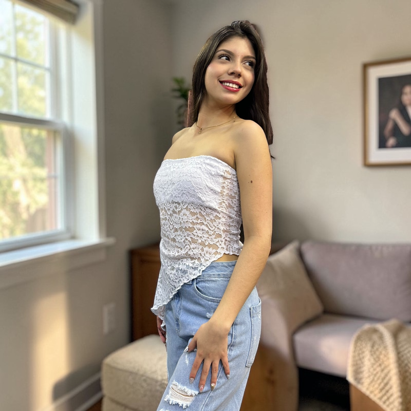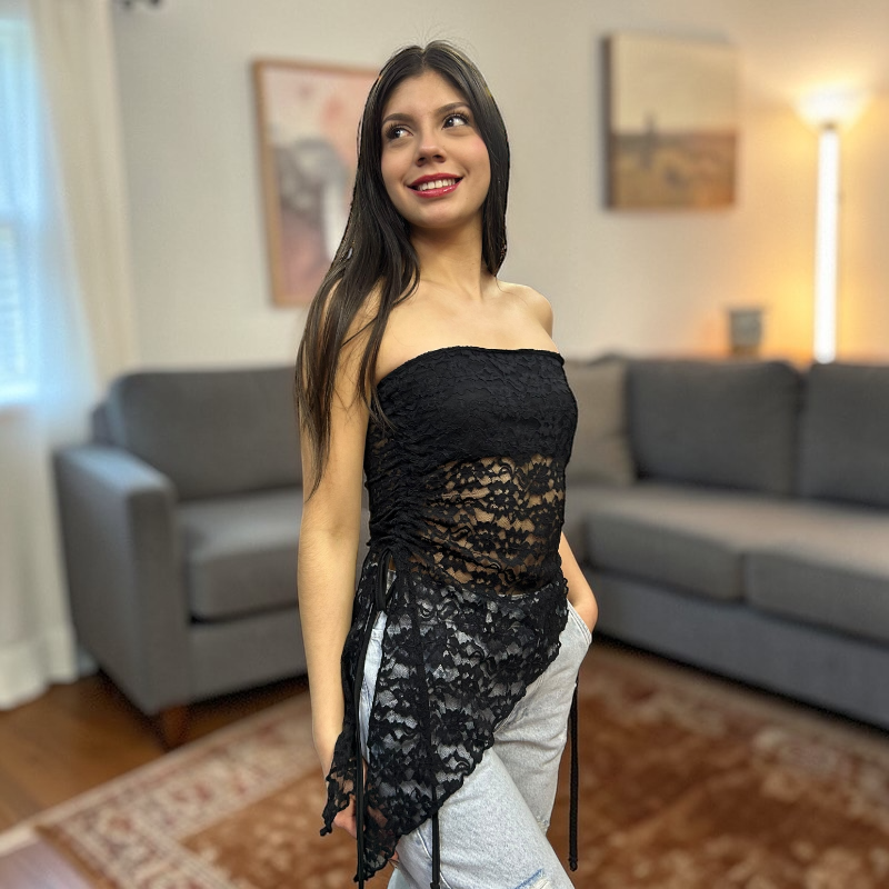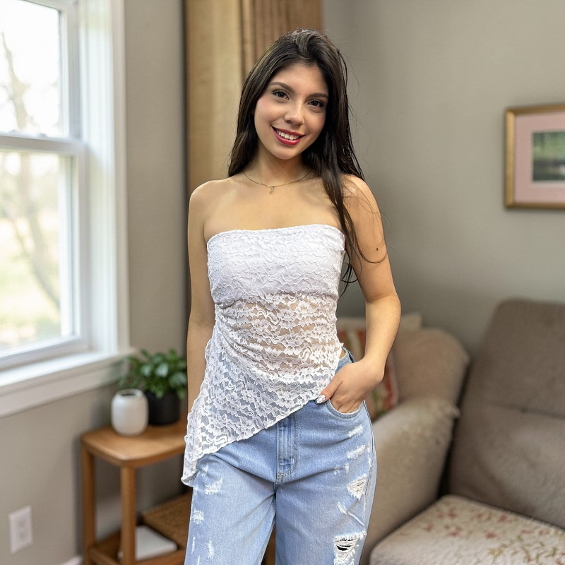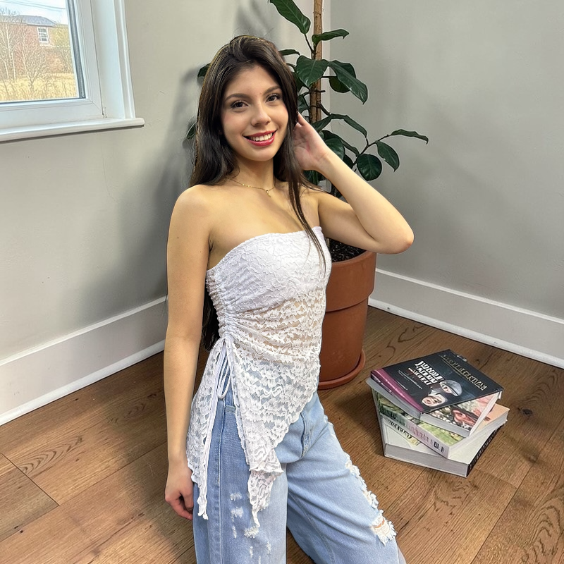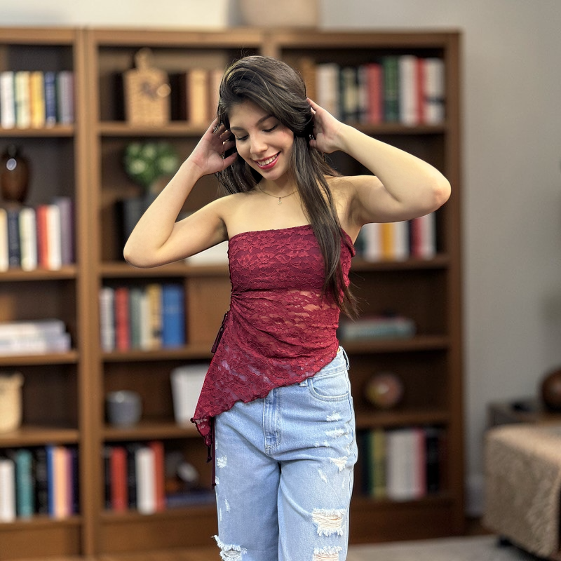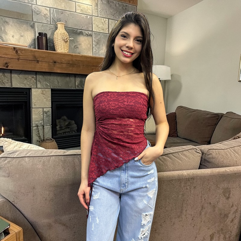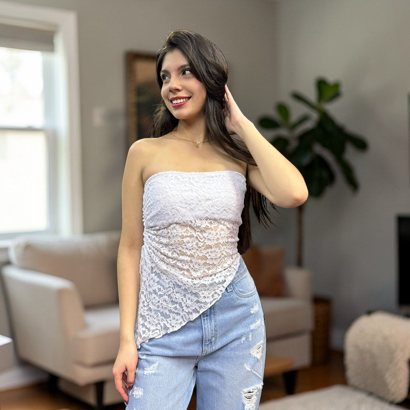 Es una prenda femenina y sofisticada que le dará un toque especial a cualquier outfit. Su diseño strapless resalta los hombros y el cuello, creando un look elegante y moderno. Está confeccionada en tela tipo encaje, lo que le aporta un estilo delicado y muy atractivo. Además, su diseño asimétrico en la parte inferior le da un detalle único que estiliza la figura y hace que destaque en cualquier ocasión.