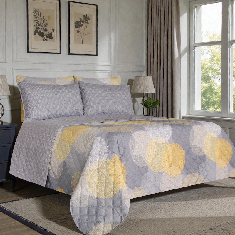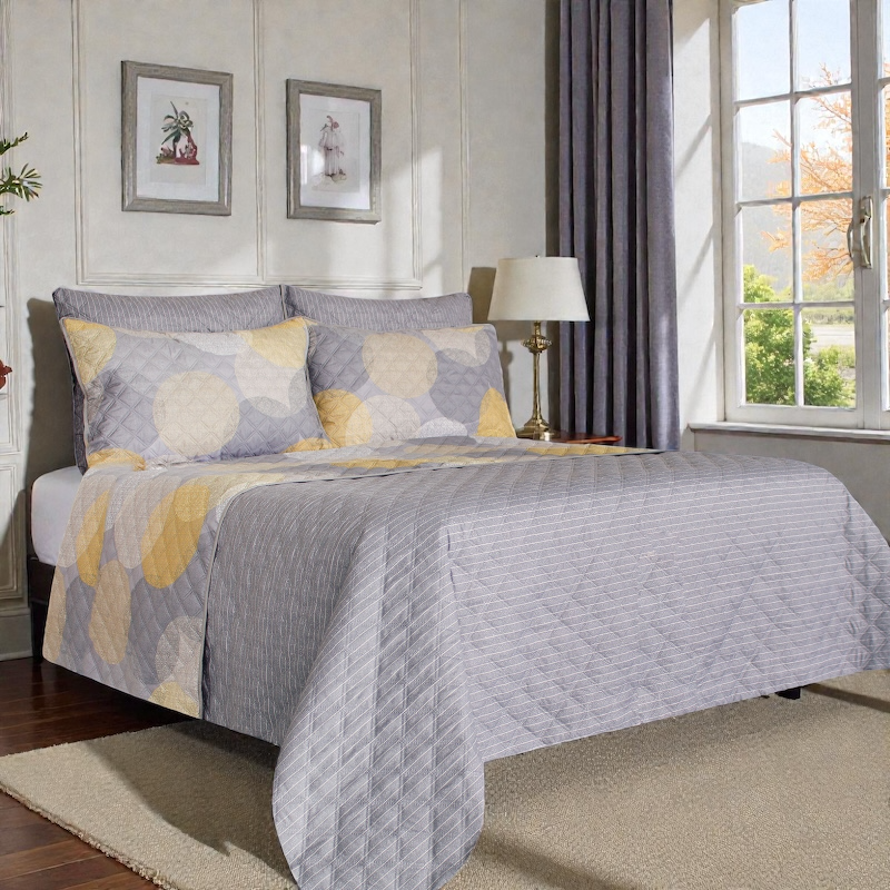Este cubrelecho tipo español ofrece un equilibrio perfecto entre estilo y comodidad. Su diseño reversible permite alternar entre dos estilos: un patrón moderno con figuras geométricas y un estampado ornamental de inspiración europea, brindando versatilidad para cualquier dormitorio.