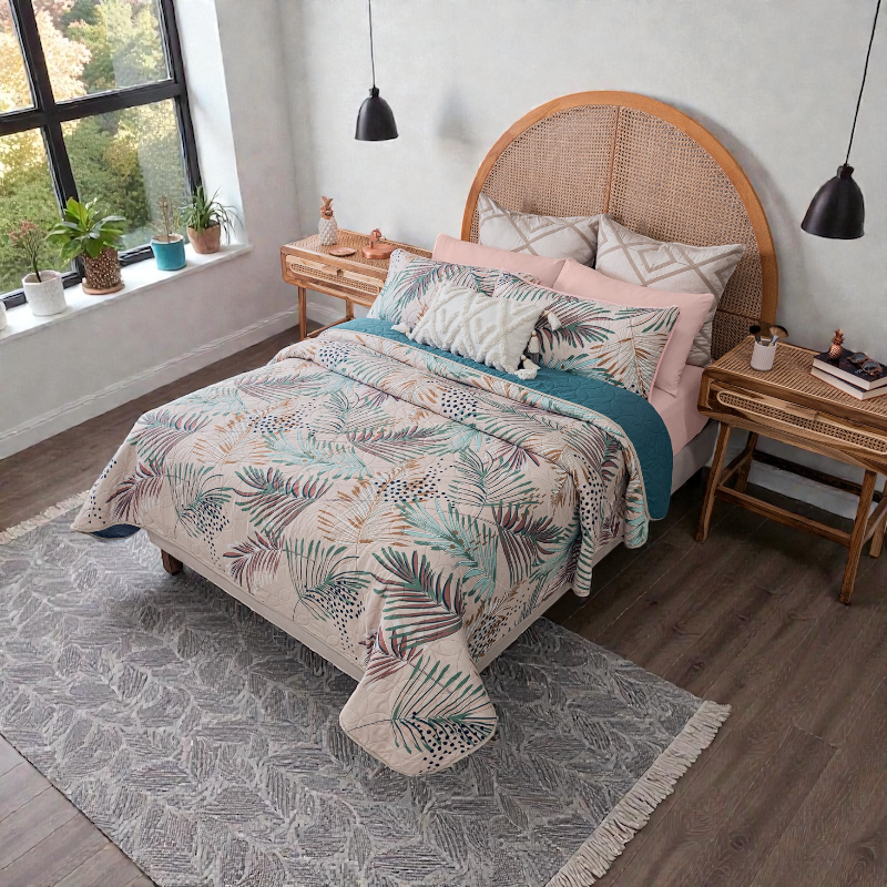 Está elaborado en tela ligera, acolchada y de tacto suave, ideal para usar en climas cálidos o templados. Sus colores vibrantes se mantienen disponibles en varias combinaciones, permitiendo escoger la opción que mejor se adapte a la decoración de tu hogar.