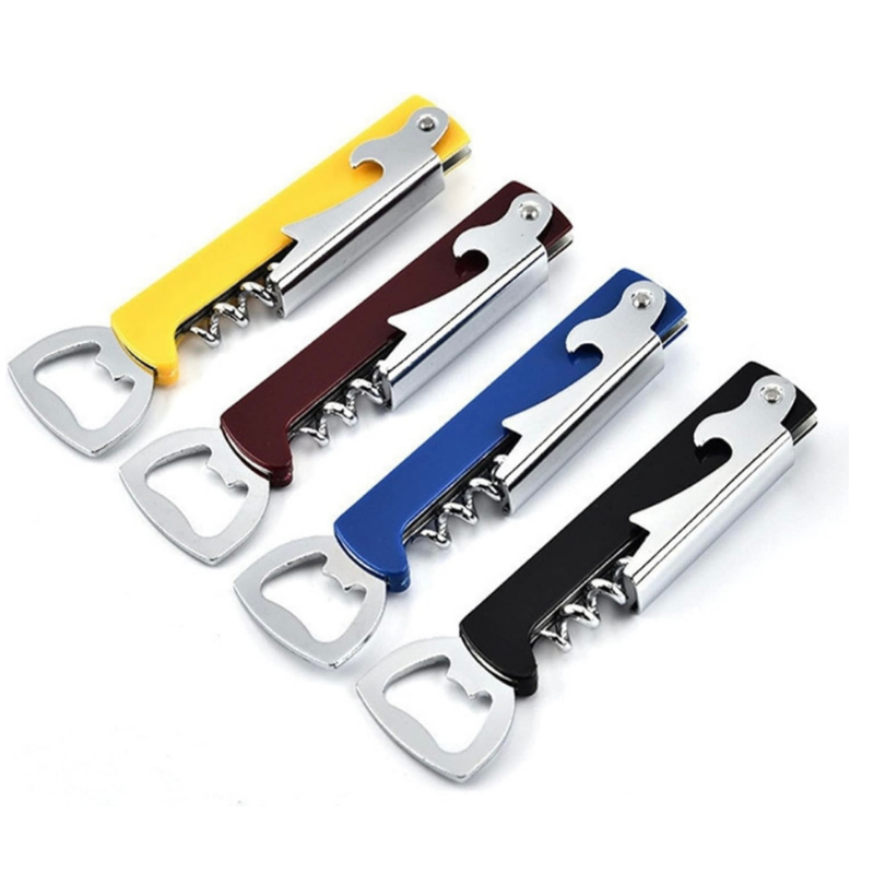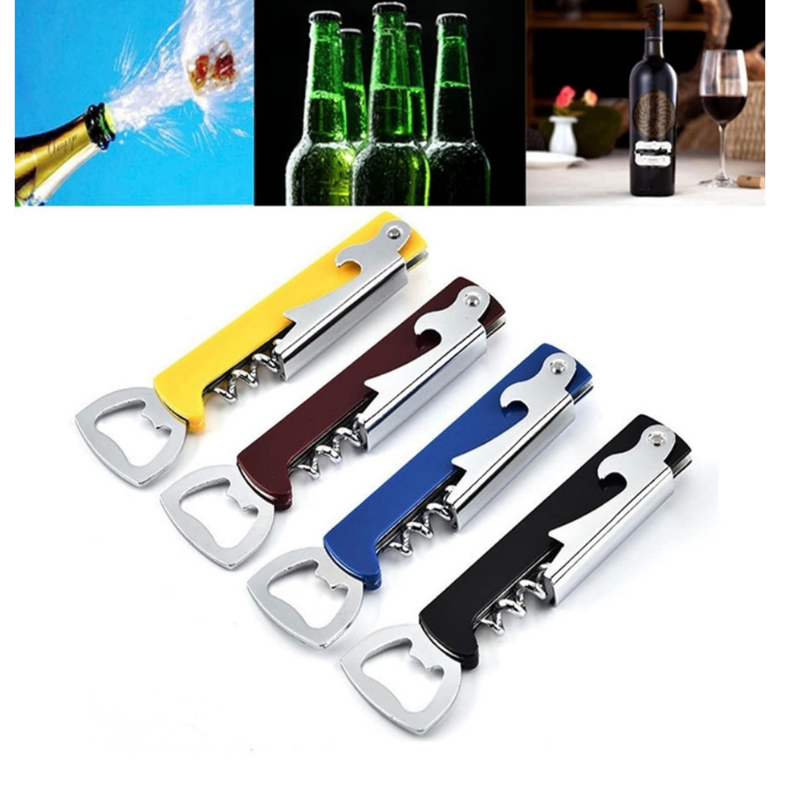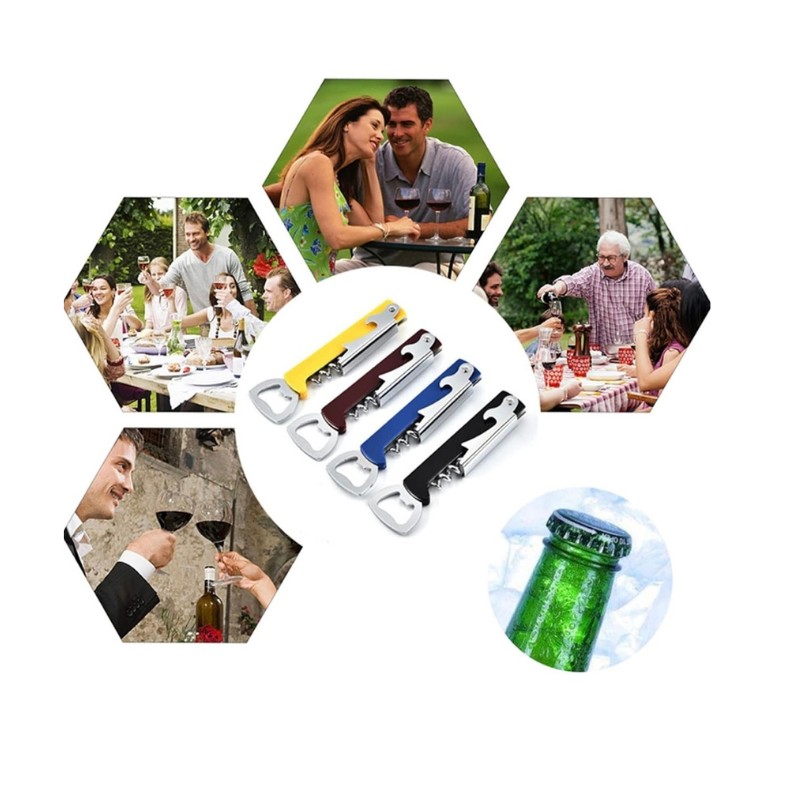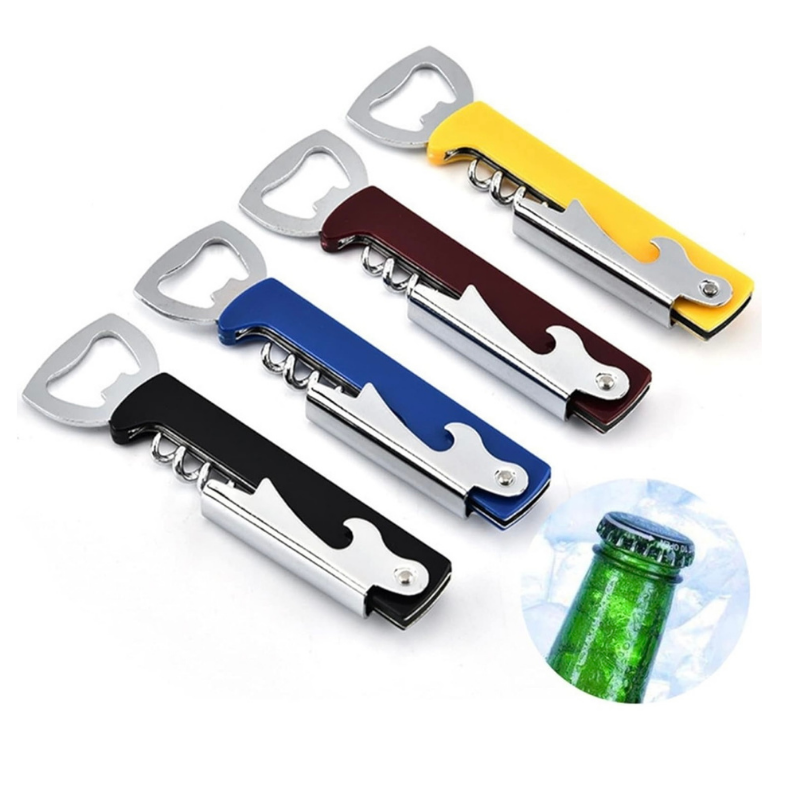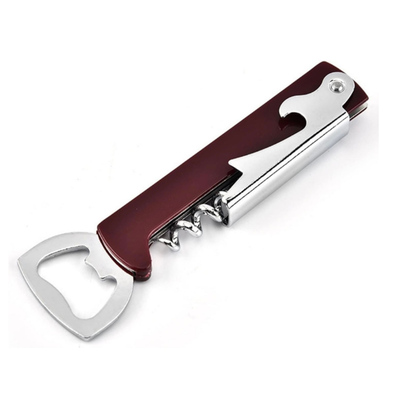 Cuenta con tres funciones en un solo diseño: sacacorchos para abrir botellas de vino, destapador para tapas metálicas y una pequeña navaja para retirar sellos o envolturas. Su diseño plegable lo hace seguro, práctico y fácil de guardar o transportar, ideal para tener en casa, llevar a reuniones o usar en negocios.