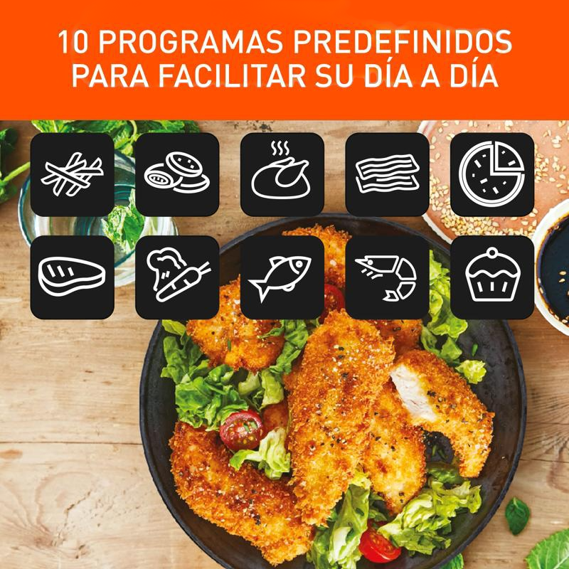 Convierte cada comida en una experiencia inolvidable con la airfryer, diseñada para facilitar tus recetas familiares. Cuenta con su amplia capacidad de 5 Litros, es perfecta para preparar porciones generosas que deleitarán a toda la familia. Además, ofrece 10 programas automáticos que facilitan la preparación de todo tipo de recetas. ¡Hazla parte de tu hogar y lleva tus comidas al siguiente nivel!