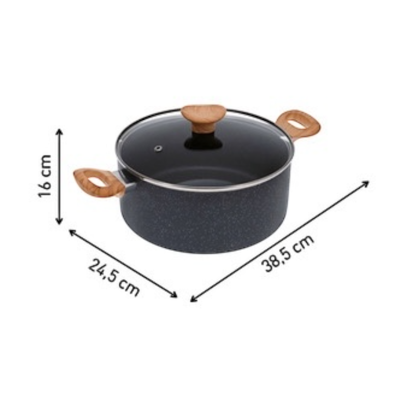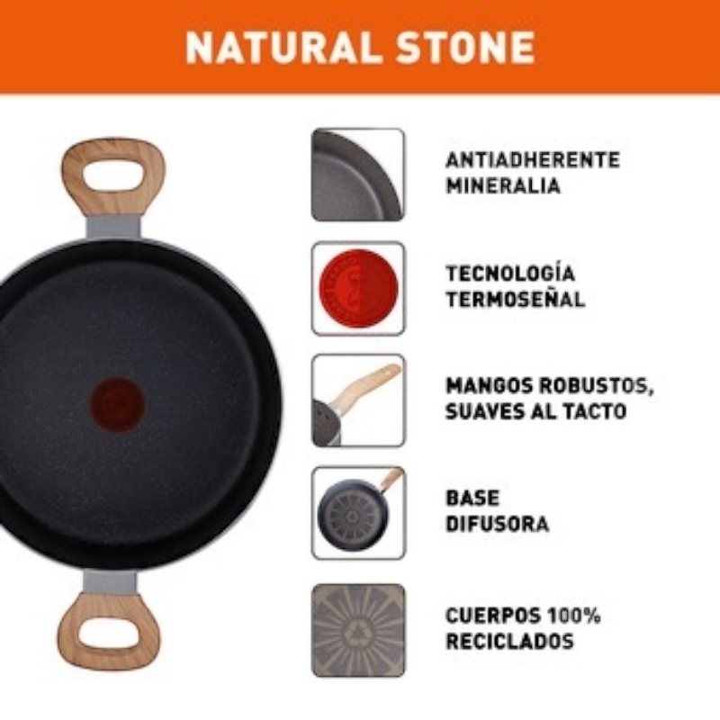 Cocina saludable y cuida el planeta con la linea Natural Stone. Diseño natural y sostenible, elaborado con materiales amigables con el medio ambiente y recubrimiento antiadherente Mineralia libre de tóxicos, reforzado con minerales naturales. Cocina con confianza y contribuye a un planeta más verde con cada plato.