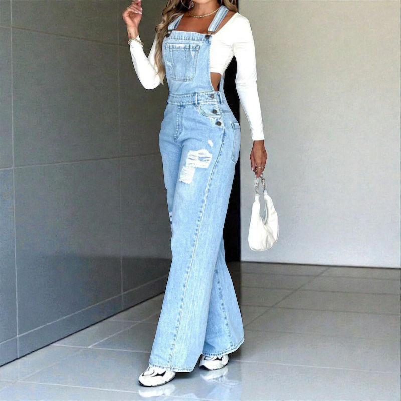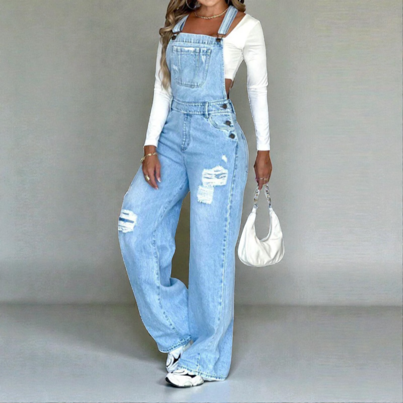 Los rotos estratégicos en la parte frontal le dan ese aire casual y actual que está en tendencia, convirtiendo este overol en la pieza perfecta para destacar en cualquier ocasión. Su tono claro facilita combinarlo con tops, camisetas o bodys en todos los colores, permitiéndote crear outfits frescos y llenos de personalidad.