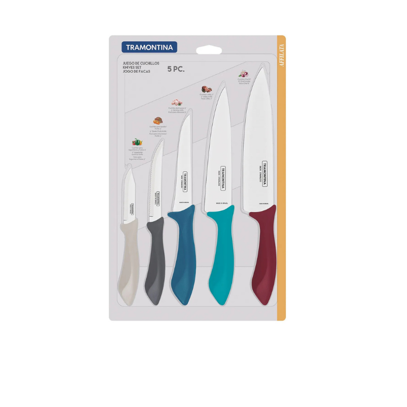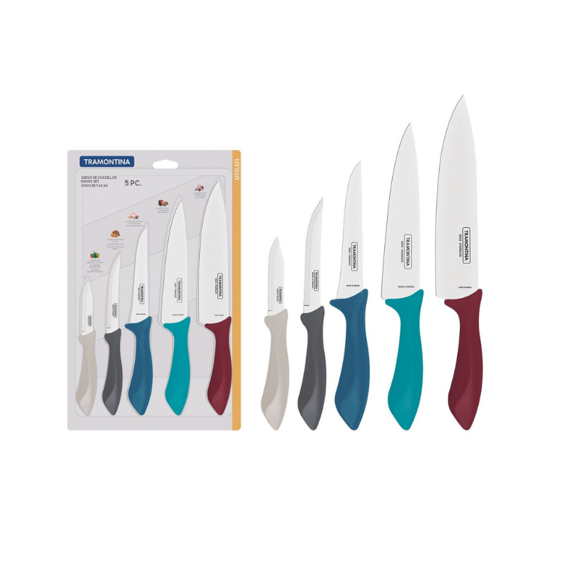 Este completo set de cuchillos de 5 piezas, diseñado para cubrir todas las necesidades básicas de corte en la cocina. Cada cuchillo cuenta con una hoja de acero resistente que ofrece cortes precisos y eficientes en carnes, verduras, frutas, pan y otros alimentos.
