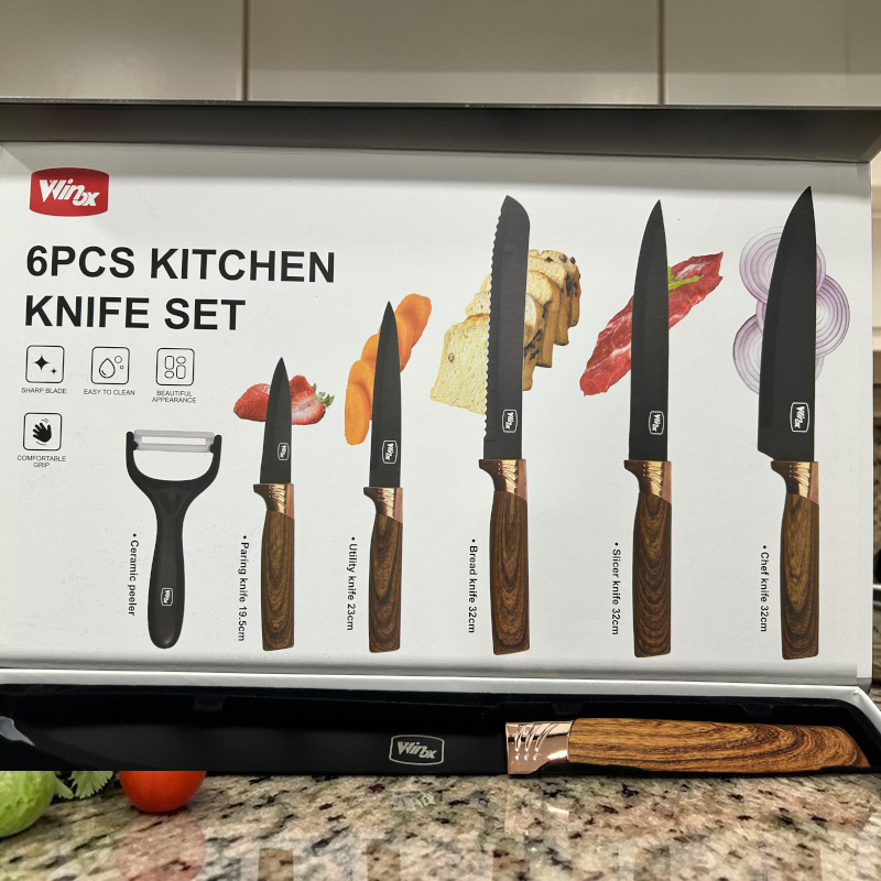 Renueva tu cocina con este elegante set de cuchillos de 6 piezas, diseñado para ofrecer precisión, durabilidad y estilo en cada corte. Incluye los cuchillos esenciales para todo tipo de preparaciones: cuchillo de chef, cuchillo rebanador, cuchillo para pan, cuchillo utilitario, cuchillo para pelar y pelador cerámico.