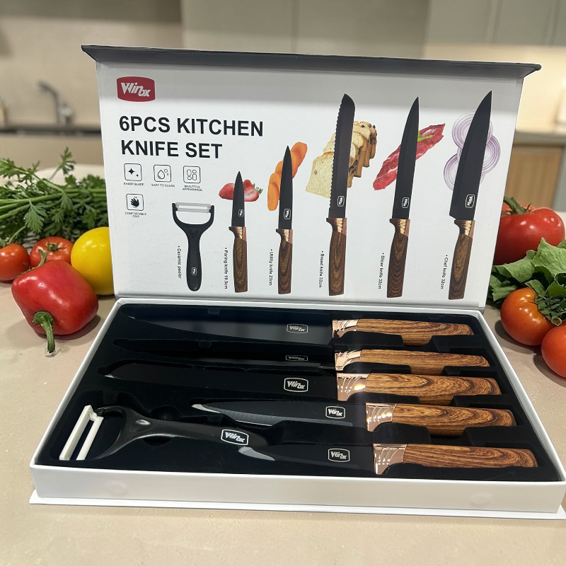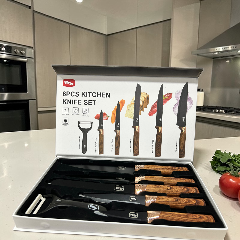 Set de Cuchillos de Cocina 6 Piezas con Pelador – Acabado Negro y Mango Tipo Madera