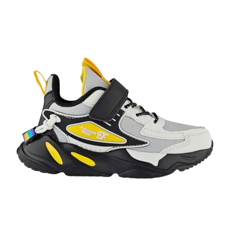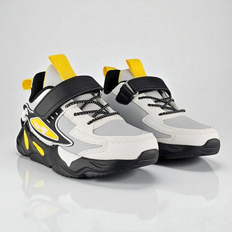 La combinación de tonos gris y blanco con líneas amarillas y suela negra crea un look contemporáneo, ideal para niños activos y con estilo.