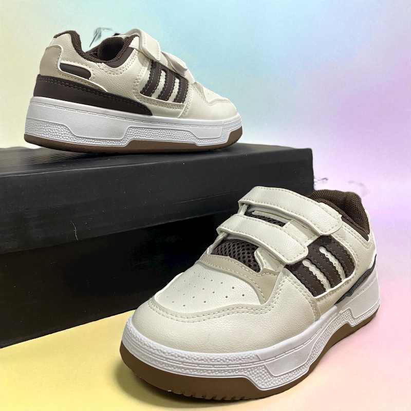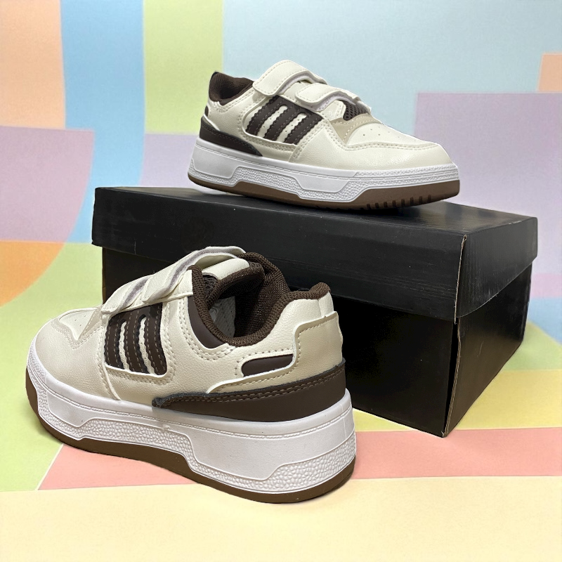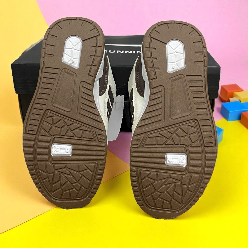 tenis infantiles color claro con detalles café, pensados para niños que aman moverse, jugar y lucir bien.