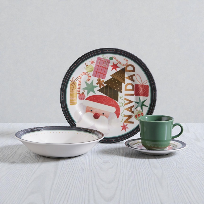 • Diseño festivo inspirado en la temporada navideña: decoraciones con motivos de Navidad como Santa Claus, regalos, estrellas y pinos ideal para vestir la mesa con alegría y espíritu familiar.