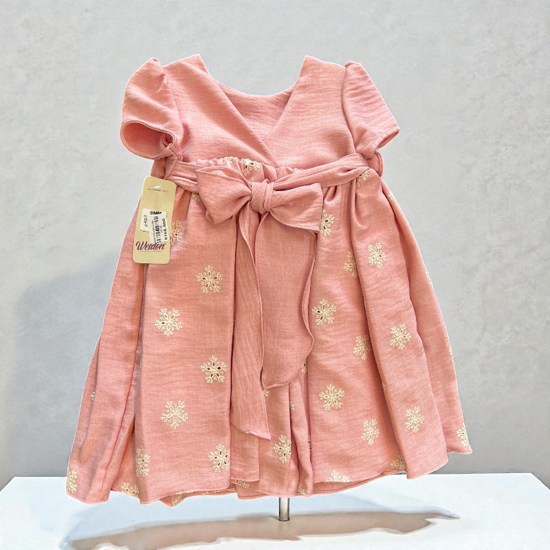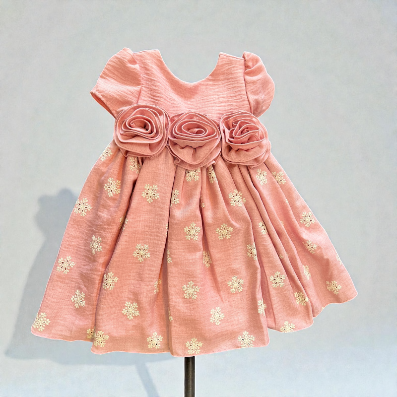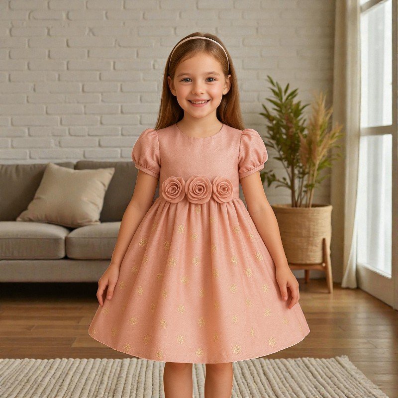 Vestido para niña confeccionado en tela suave con acabado ligeramente satinado. Presenta tres rosetas aplicadas en la cintura que destacan como detalle principal, mangas cortas abullonadas y una falda con vuelo y pliegues decorada con motivos dorados. Diseño elegante y cómodo, ideal para eventos y ocasiones especiales.