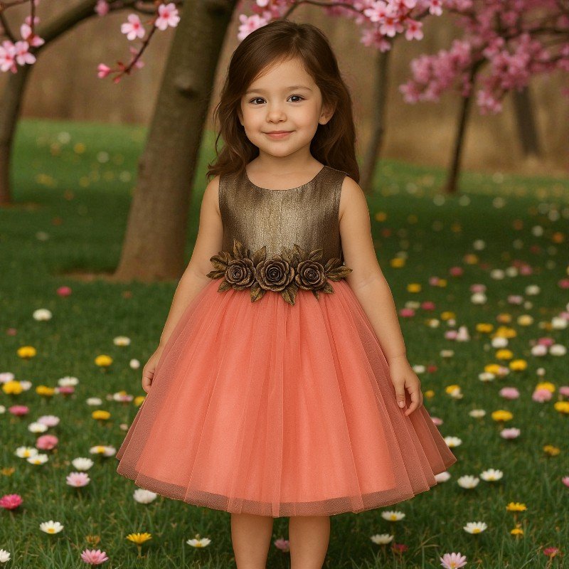 Vestido sin mangas con cuerpo en tejido lamé metalizado, un material tipo poliéster con brillo dorado o bronce que aporta estructura y un acabado elegante. La cintura incluye apliques florales en tela metalizada, diseñados para simular rosas y hojas, cosidos directamente en la unión entre el cuerpo y la falda.
